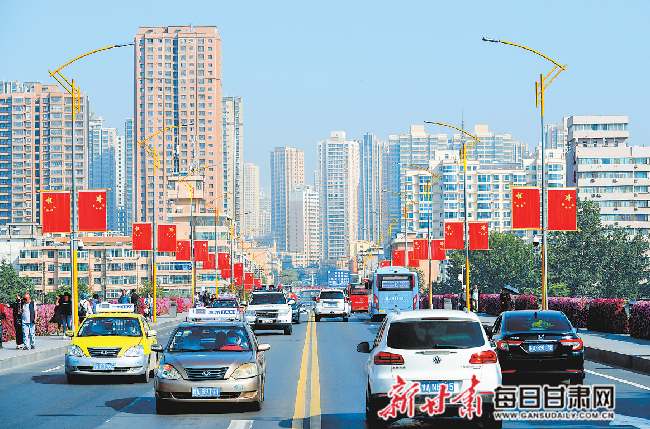 10月1日,兰州市主次干道穿上了“中国红”新装,鲜艳的五星红旗成为兰州街头最美的风景线。新甘肃·甘肃日报记者 盛学卿