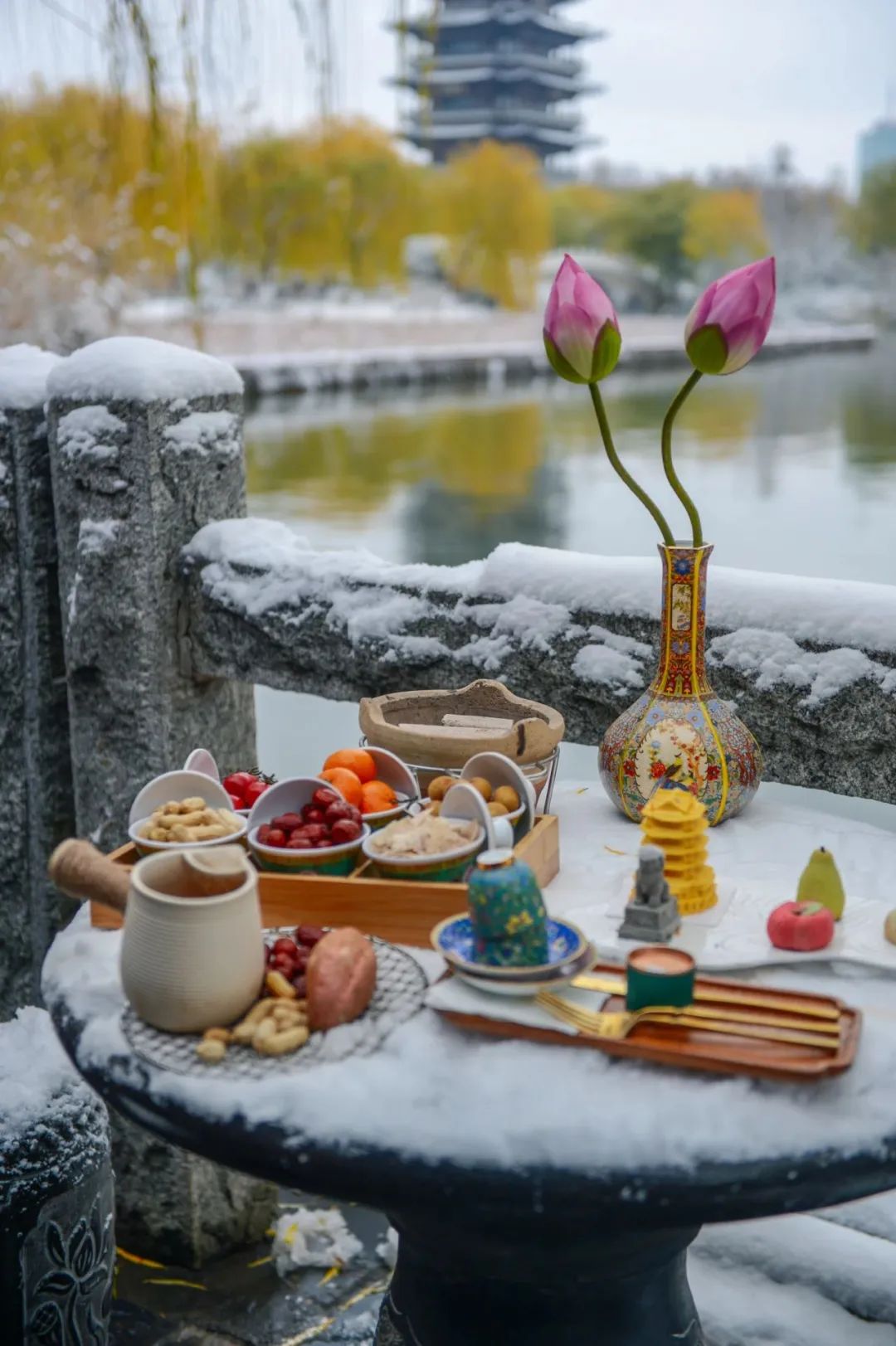 现代与古典交融,矗立于繁华之间,青瓦粉墙,雕梁画栋的南丰戏楼是济南“曲山艺海”的历史见证之一。冬日,走进南丰戏楼,点一份以济南文化为灵感设计的下午茶套餐,“雨荷的梳妆匣”、“南丰先生(曾巩)的梦”、“曲山艺海话济南”,不同的主题、不同的滋味、不同的体验。泉水边、明湖畔,围炉煮茶,别样精彩。