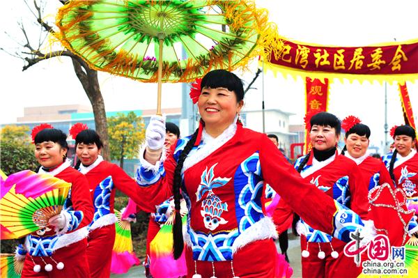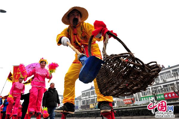 江苏睢宁年味足 双沟镇民俗汇演高跷舞狮划旱船