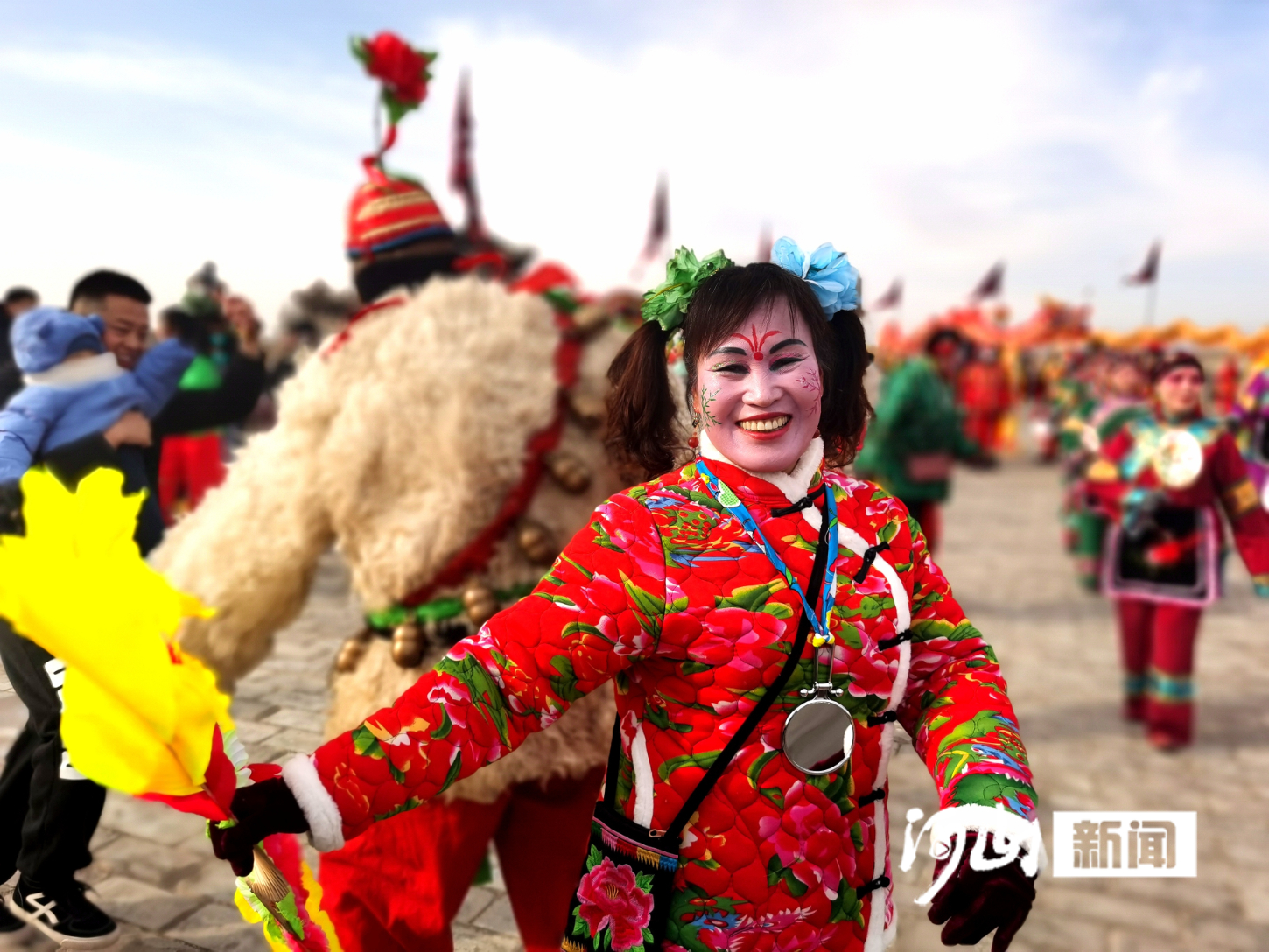 城墙北端,毛色鲜艳的“狮群”踩着节奏感十足的鼓点嬉戏玩耍,时而站立而起,时而翻滚跳跃;不远处有两支近一人高的高跷队伍,前进后退有章法,左右扭转身法活;视线一转,一条金龙正追逐在一颗“龙珠”之后,翻转腾挪间尽显矫健身姿;玉皇阁南侧停车场区域,划旱船、扭秧歌等同样令人流连忘返。观看表演的群众也毫不吝啬掌声和叫好声,使得鼓乐手们也乐得再加一把子力气。