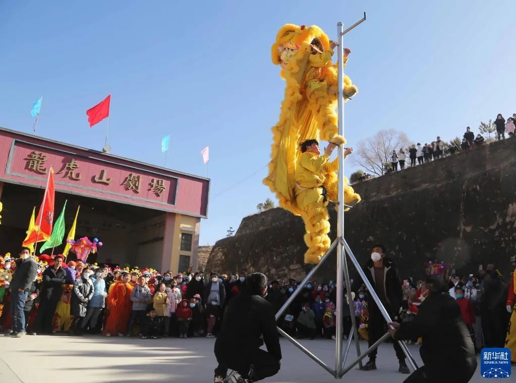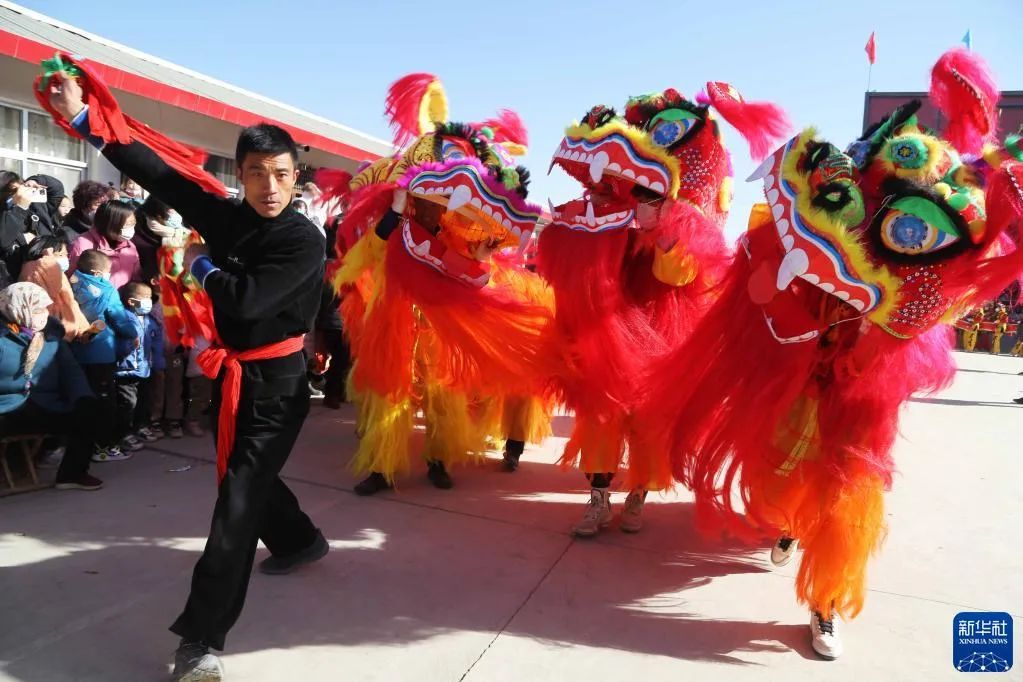 1月6日,甘肃省定西市安定区内官营镇万崖村社火队演练传统社火节目舞狮。新华社发(王克贤 摄)