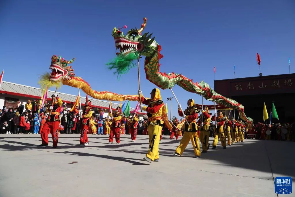 1月6日,甘肃省定西市安定区内官营镇万崖村社火队演练传统社火节目舞龙。新华社发(王克贤 摄)
