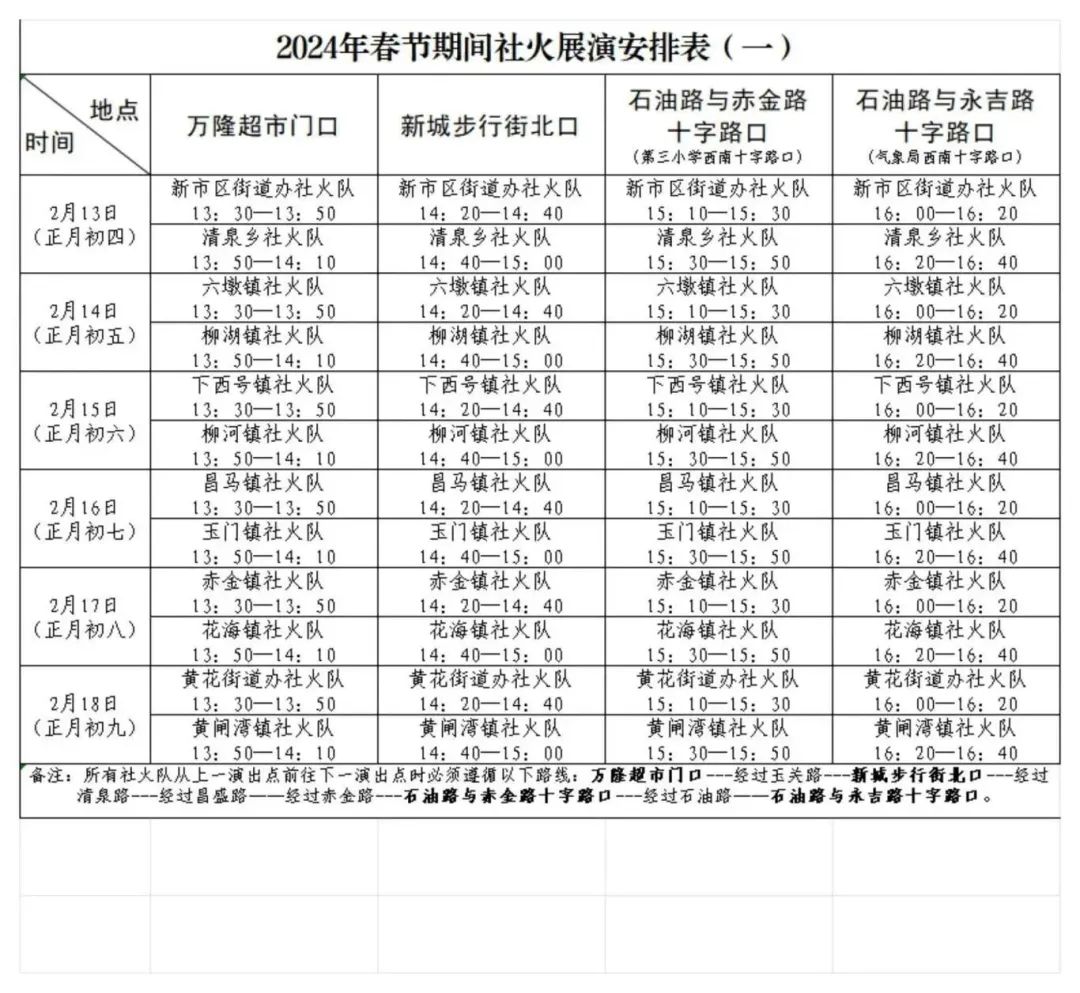 1.轮番上阵拜大年时间:2月13日(正月初四)至2月18日(正月初九)地点:万隆超市门口---经过玉关路---新城步行街北口---经过清泉路---经过昌盛路——经过赤金路---石油路与赤金路十字路口---经过石油路——石油路与永吉路十字路口。