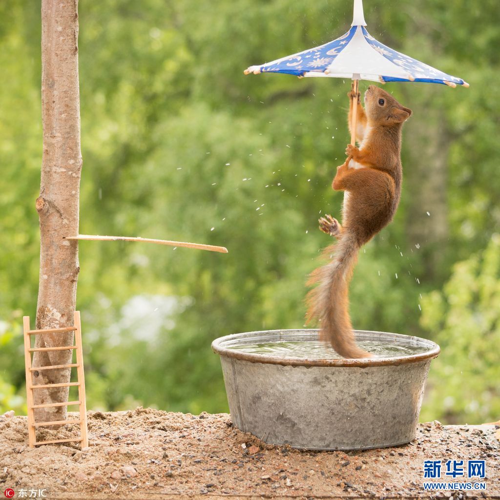 2017年7月6日报道(具体拍摄时间不详),夏天来啦,来自瑞典的松鼠摄影专业户Geert Weggen又为他的小模特们拍摄最新写真啦,这次的拍摄主题是戏水,图片中,可爱的小红松鼠们在Geert为它们悉心准备的“澡盆”里撒欢水花四溅,天生平衡力超强的它们还在盆沿上玩起了倒立,抱着遮阳伞秀功夫欢乐极了。(图片来源: 东方IC)