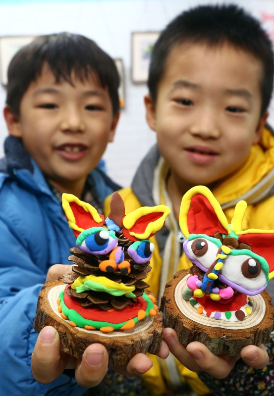 1月7日,两位小朋友展示他们在庙会上用粘土制作的“年兽”。