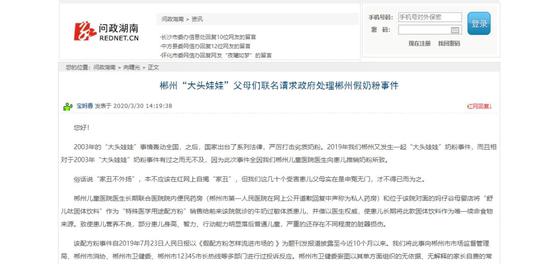 今年3月30日,有十几位家长在“问政湖南”上发表联名信,称2019年郴州发生一起“大头娃娃”奶粉事件。其中郴州儿童医院医生被指与医院院内药房与对面一家名为“妈仔谷”的母婴店,将名为“舒尔呔”的固体饮料销售给牛奶过敏体质患儿,结果导致不少幼童营养不良,部分幼童身高、智力及行动能力明显落后于一般儿童,严重者甚至还出现不同程度的器官损伤。