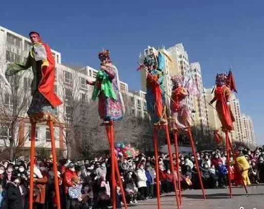 高跷民间称高拐子,踩高跷的人身着历史戏剧人物服装。一般扮演的有《断桥》《盗仙草》《挑黄袍》《唐僧取经》《八仙过海》《包公赔情》等戏剧中的人物。在强烈节奏的锣鼓音乐伴奏下,做行进队列或场地定点表演。如表演断桥,由许仙,青蛇、白蛇3人用秦腔调唱台词,加以简单的手势动作。