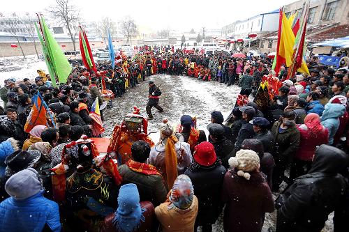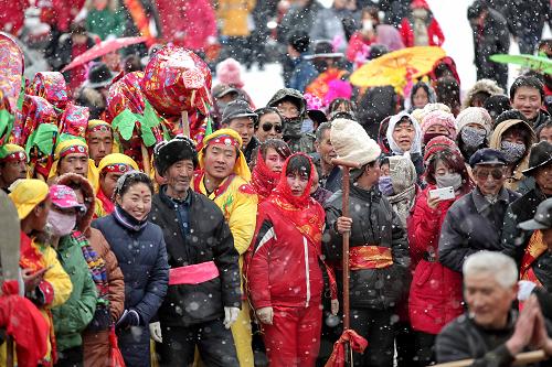3月4日,社火队在雪中准备上场表演。新华社发(杨昕 摄)