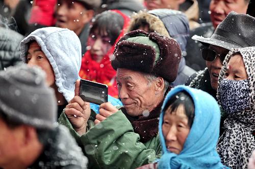3月4日,一位老人在雪中用手机拍摄社火表演。新华社发(杨昕 摄)
