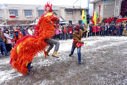 3月4日,社火队在雪中表演舞狮。新华社发(杨昕 摄)