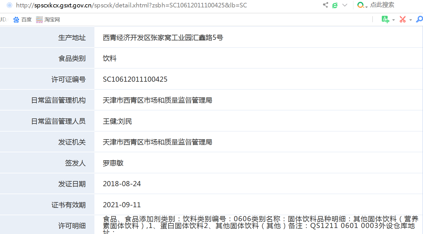 新京报记者根据网络图片信息查询到,“倍氨敏”的生产许可证号为SC10612011100425,委托方为湖南唯乐可健康产业有限公司,加工方为天津市德恒科技有限公司制造中心(曾用名为“天津市德恒科技有限公司张家窝加工厂”)。经查询,该产品类别为蛋白固体饮料,并非特殊医学配方食品。