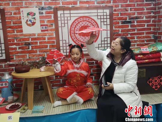 家长和孩子体验东北特色二人转手绢 刘栋 摄