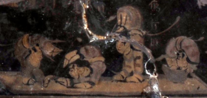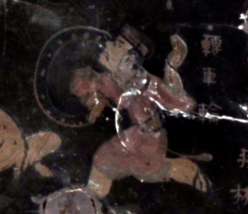 乐舞百戏最早见于两汉时期的墓葬,这个主题还延续到之后的朝代。孙吴大将朱然的墓中出土了一件漆盘,盘中绘有一幅宴乐图,其中也有百戏内容,并且画宴乐图的画匠还很贴心的为每种百戏附上榜题(其实就是说明牌啦)。