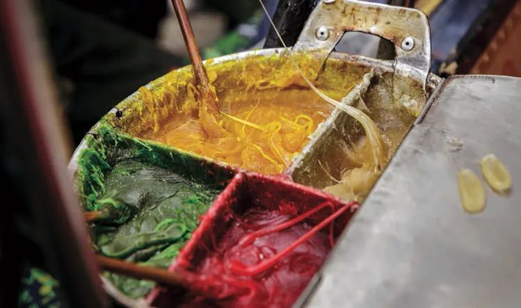 由于自己加工糖稀工序多、周期长,现在我们都是在市场上舀回糖稀后,用大火烧滚后再用文火慢慢熬出水分,擀杖搅、铲子铲,两三个小时后,等糖稀变得黏糊、能拉出丝了(冷却后能弹断,1 斤糖稀能熬出六七两成品),先倒在铁盆里冷却一会儿,再倒在用砖砌成、里面铺着塑料纸(铁盆内、塑料纸上要先抹上油,糖稀凉后不黏)的小方池中,冷却变硬后收藏起来。每次出摊的时候,就带上几块,用的时候拿小锤子敲下一些,放在糖锅中十字形的4 个小方格内(过去也用3 个方格锅),加热变稀后,分别加入红、绿、黄3 种食用色素(另一方格内为淡黄色的糖稀原色)。