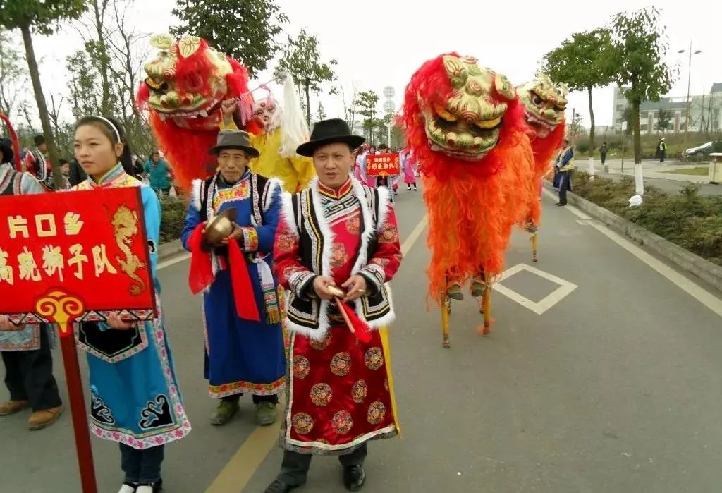 北川羌族自治县片口乡位于县境西北部,是北川县最边远的乡镇之一,也是通往松潘和平武泗耳的要道。在旧社会,片口又是鸦片的集散之地,各州、府、县的大烟贩聚集在此,加之辖区及周边出产碱、药材、山禽、兽皮等,因此贸易兴盛、文化繁荣,有“小成都”之称。为祈求太平、驱赶野兽、驱邪避鬼,羌民们就头戴彩色狮盔,脚踩木制高跷,手执彩色狮尾随意舞动,以显示威猛。后来,高跷狮舞作为片口的一种传统民俗文化活动在当地盛行,每逢节日或重要活动,羌民们都喜欢敲锣打鼓舞狮助兴。