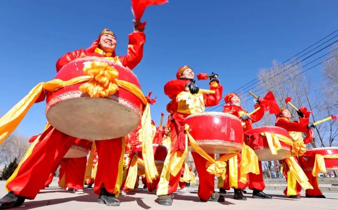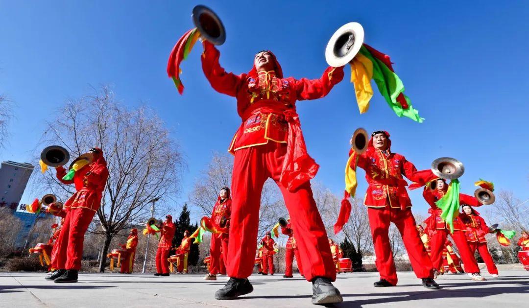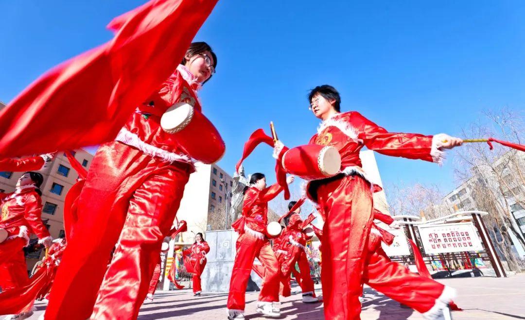 1月28日,临泽县沙河镇惠民社区文化广场上,社火队太平鼓表演组的群众演员们加紧排练《太平盛世鼓欢歌》。