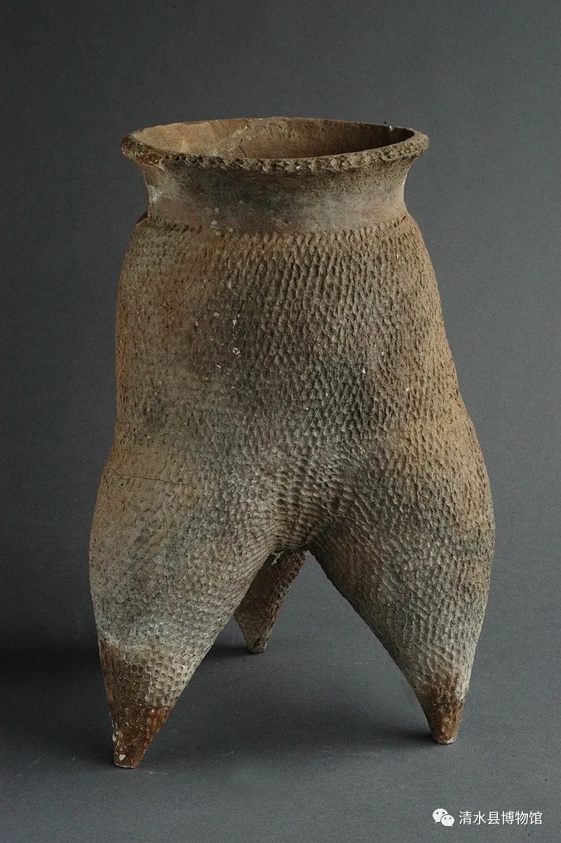 齐家文化绳纹灰陶鬲,高34cm,口径16.5cm。鬲呈夹砂红陶,侈口,束颈,深腹,高裆,袋足锥状,颈以下遍布粗绳纹。