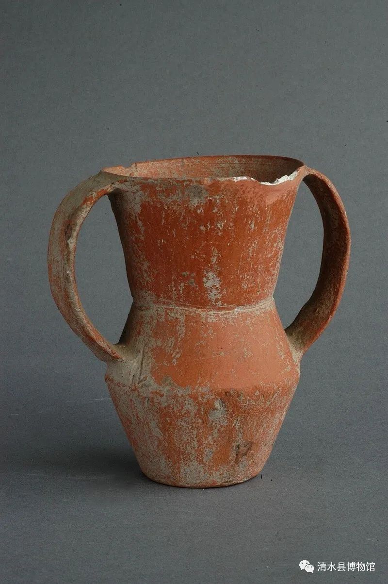 齐家文化双大耳罐,高14cm,口径9cm,底径5cm。罐泥质红陶,侈口,折颈,溜肩,收下腹,平底,对称双耳于口沿至斜肩部。