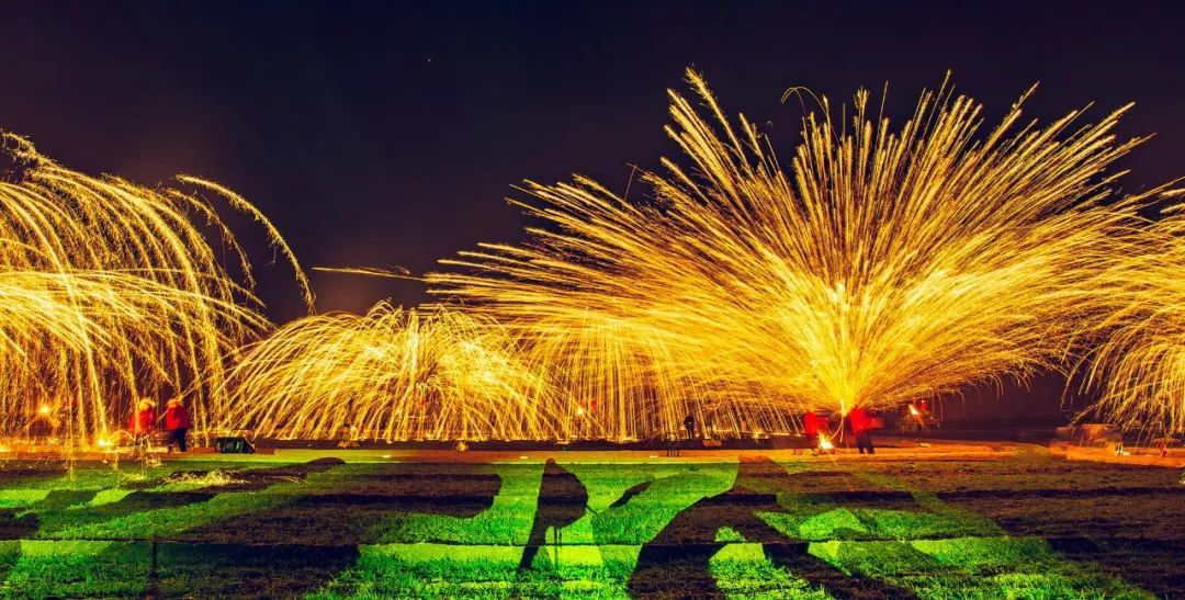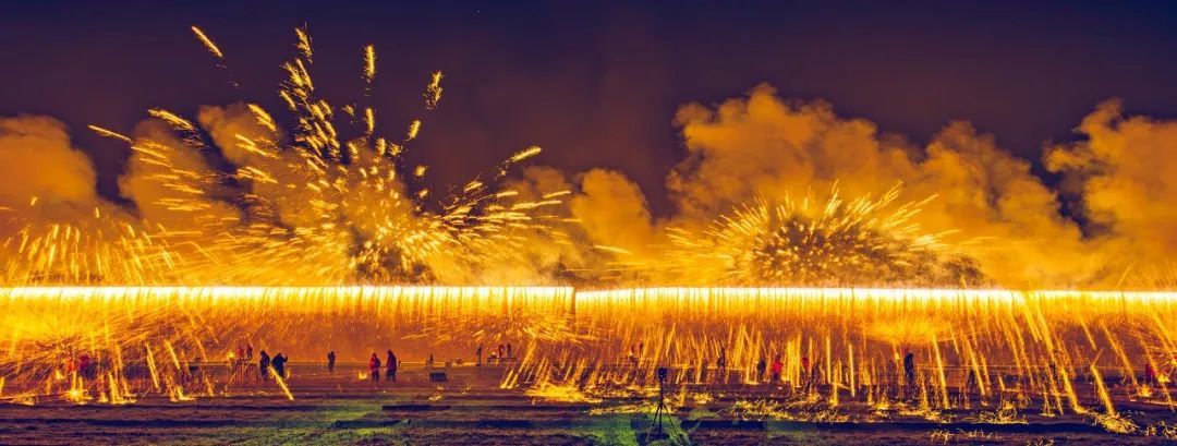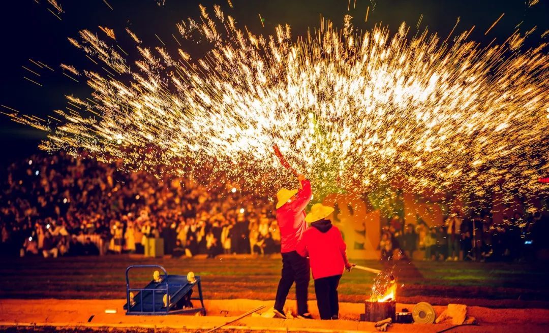 在作为古老的中华非遗打铁花表演现场,体验勇敢无畏、振奋人心的精神。在百亩麦田之上,30个点位同时绽放出火树银花,点位够多,才能打出“铁树银花落,万点星辰开”的气势。
