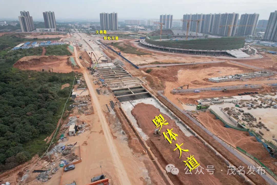全长约2760m,按双向八车道设计。奥体大道一期(包茂大道-大中路)正在抓紧路基工程、照明工程以及排水工程等施工,目前已完成施工总进度的55%左右,剩余工程量计划于2024年6月前全部完成,预计比原计划提前180天完成施工。同时,奥体大道二期(潘州大道-大中路)正在开展清表工作。