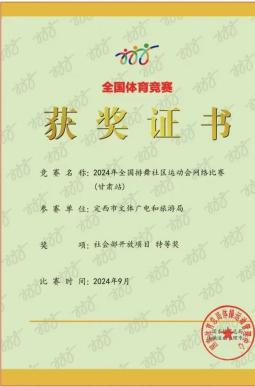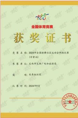 9月22日,在甘肃省社会体育管理中心主办的“全民健身我先行”2024甘肃省第七届“金色的田野”广场舞大赛中,定西市文化馆舞蹈团代表定西市文体广电和旅游局参赛,并荣获三等奖。