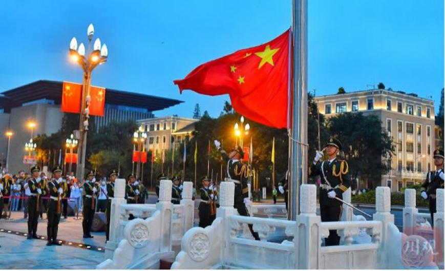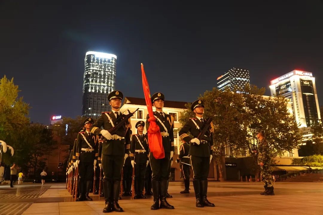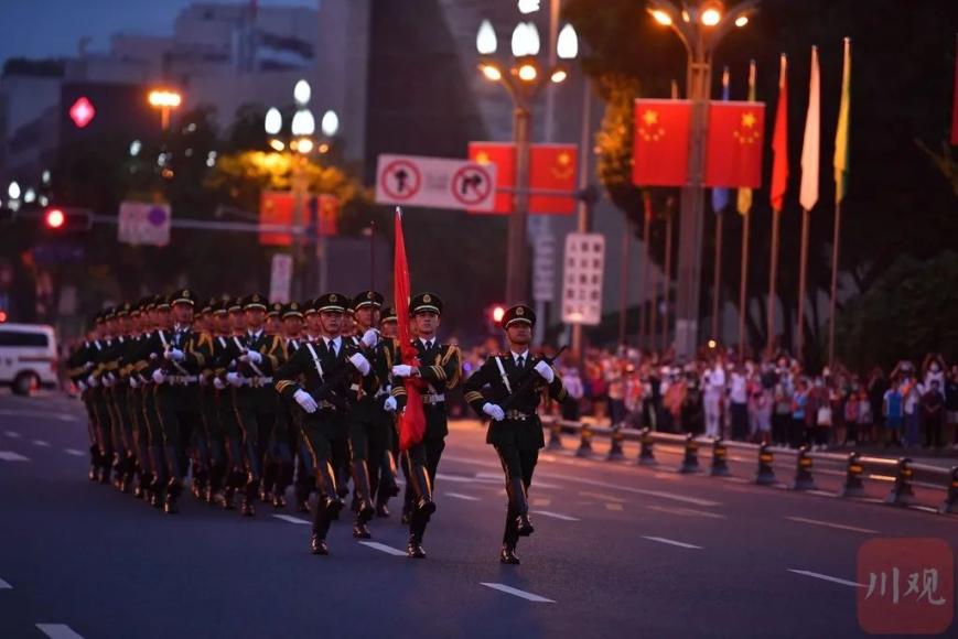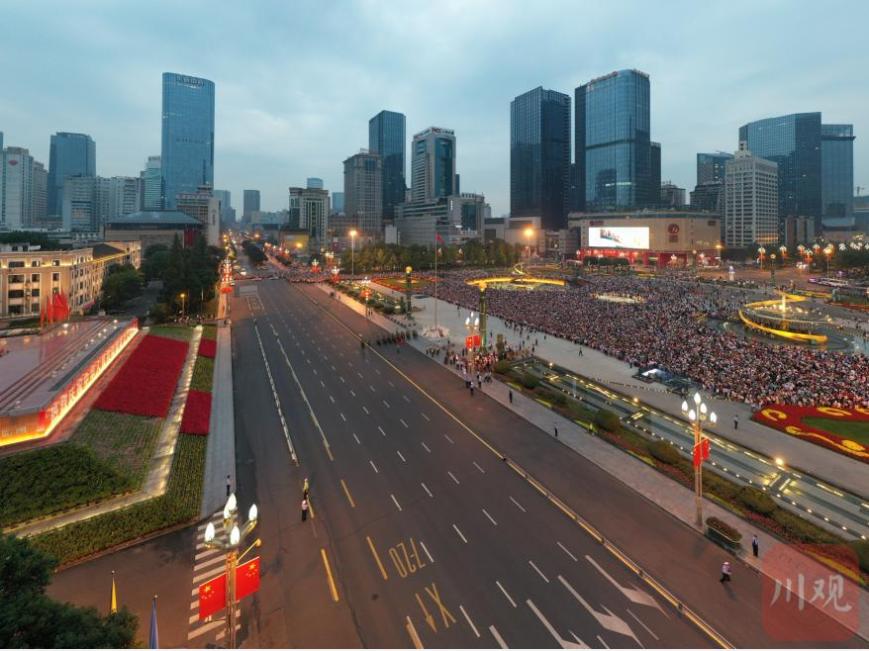 10月1日清晨6时59分,随着国歌奏响,鲜艳的五星红旗在成都天府广场上缓缓升起。7时整,《义勇军进行曲》演奏完毕,国旗飘扬在旗杆顶端迎风飘扬。