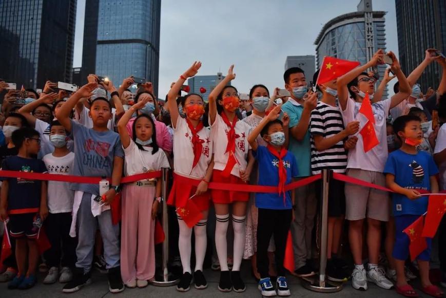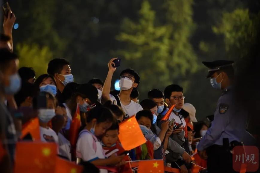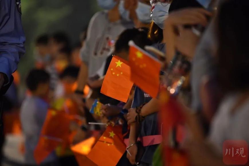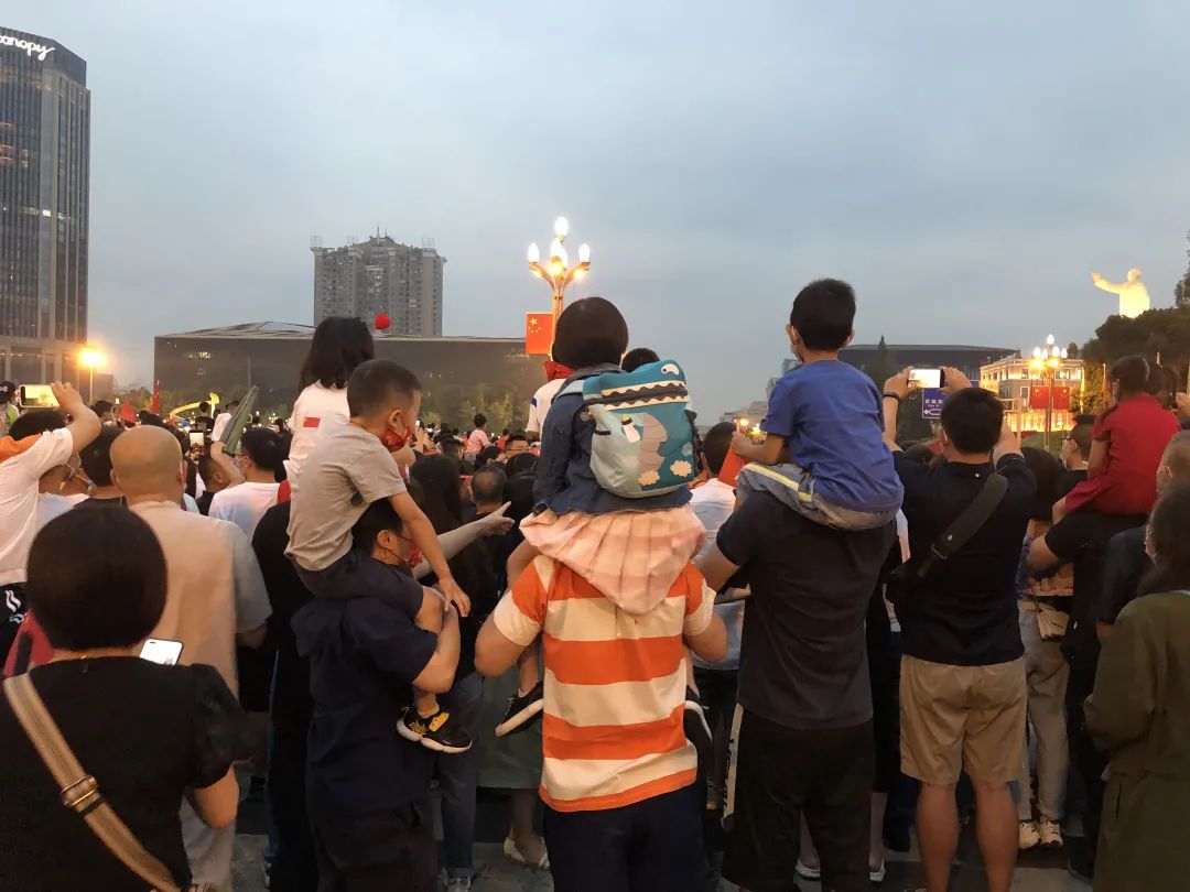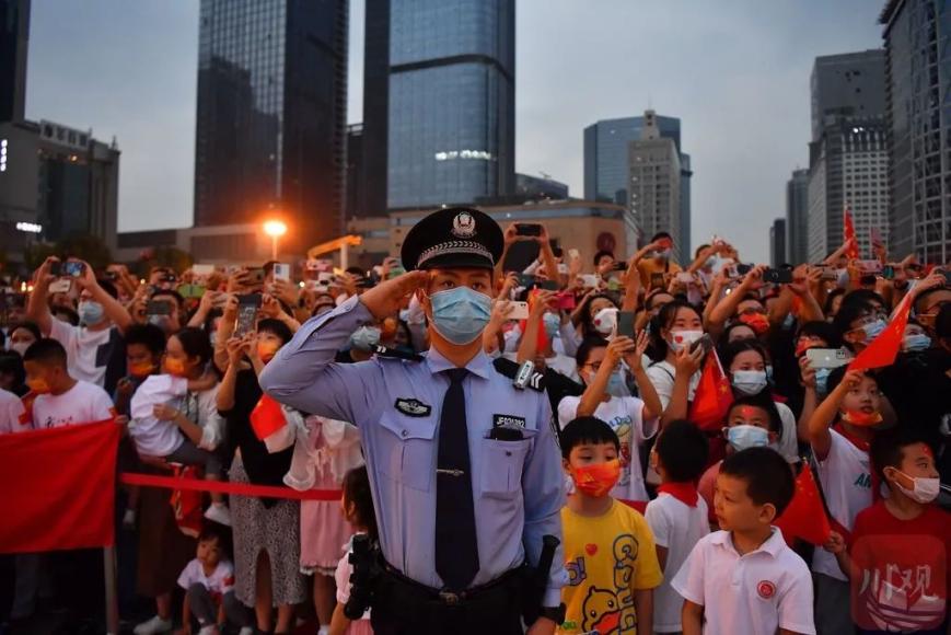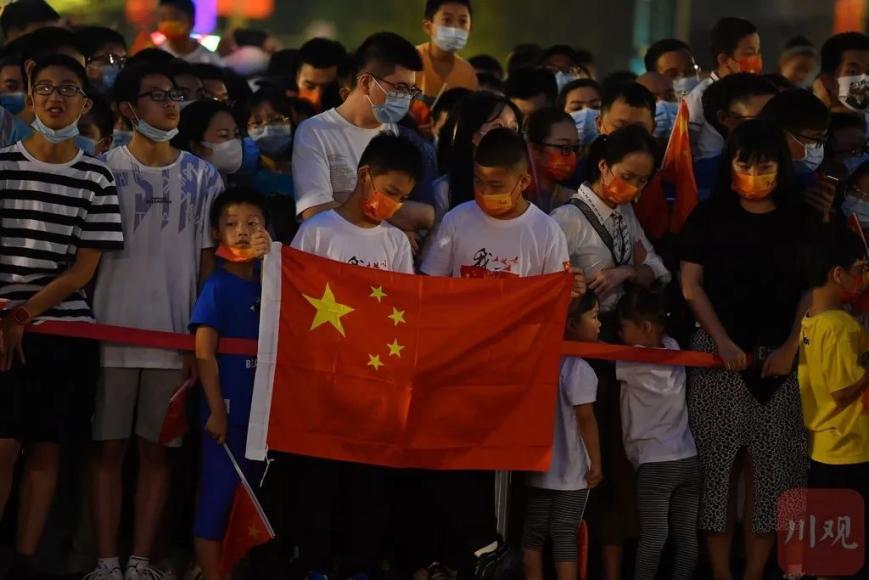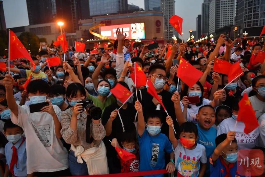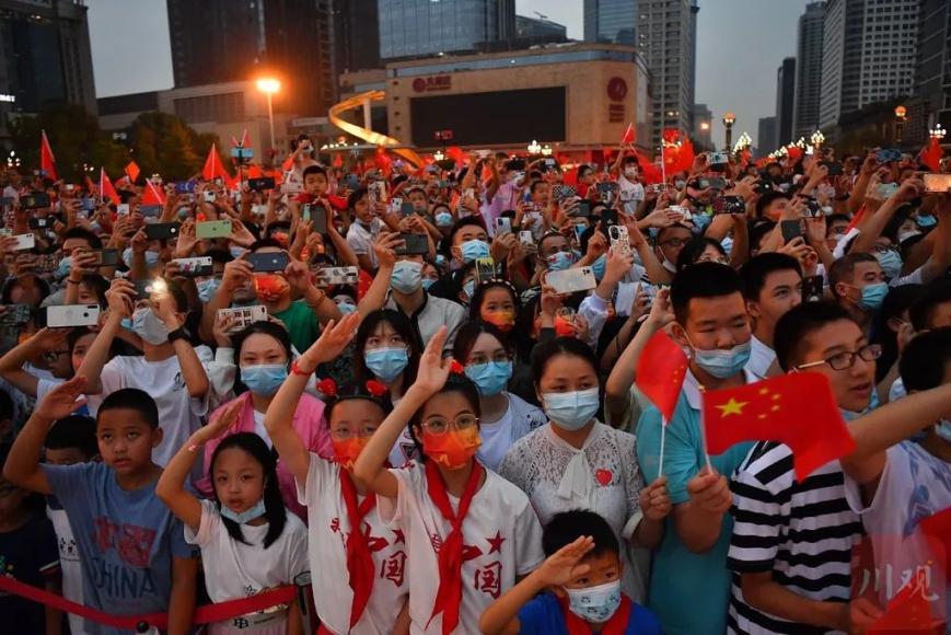 此时,庄严的天府广场上,五星红旗高高飘扬,现场爆发出热烈的掌声和巨大的欢呼声。“我爱你中国”“祝伟大祖国繁荣昌盛”的呼喊声此起彼伏,在一些市民的带动下,大家唱起了《我和我的祖国》,不停挥舞着手中的国旗,表达对伟大祖国的诚挚热爱与美好祝福。