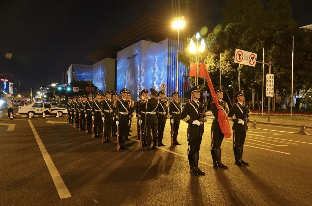 刘队长介绍说,升旗方队入场后直行路线的距离为106米,首先是齐步,之后是正步,最后再转为齐步。同时上半身对应的动作分别为托枪、劈枪、托枪。行进过程中,领队会用路边的灯柱作为标志物,来确定变化动作的位置。