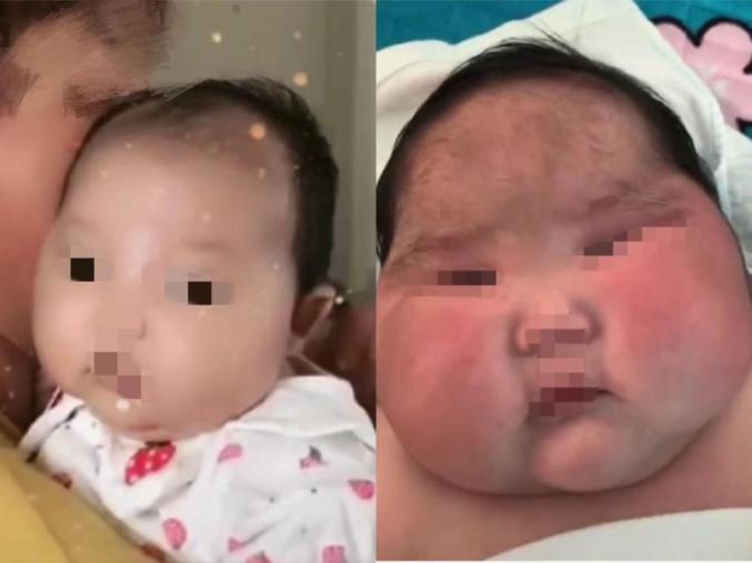 4个月大的“柚子”体重已经20斤了,和同月龄的孩子相比,她已经超重了快6斤,身上的肉像米其林轮胎一样聚成团状,脸圆乎的像漫画里的小孩,眼睛挤成一条缝,可爱,但有些过于浮肿。