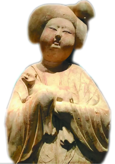 值得一提的是,女俑怀中所抱的小狗并非唐代本土的狮子狗,据说在当时叫作康国?(wō)。康国位于现在的乌兹别克斯坦撒马尔罕一带,地处当时的丝绸之路要道。这只小狗很可能是当时的康国人作为贡品进贡给唐王朝。