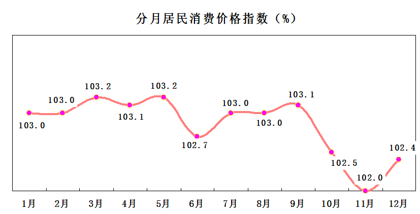 全年各月居民消费价格指数呈现高开低走趋势,与上年同期比,价格上涨最高的月份是三月和五月份,为103.2%;价格上涨最低的月份是十一月份,为102.0%。