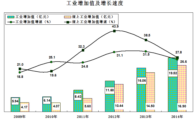 工业经济总量较快增加。全县工业完成增加值19.52亿元,比上年增长26.6%;占生产总值的比重达到34.1%,较上年提高2.5个百分点。其中,13户规模以上工业企业完成工业增加值16.9亿元,增长27.8%,占生产总值的比重达到29.6%,较上年提高1.1个百分点。