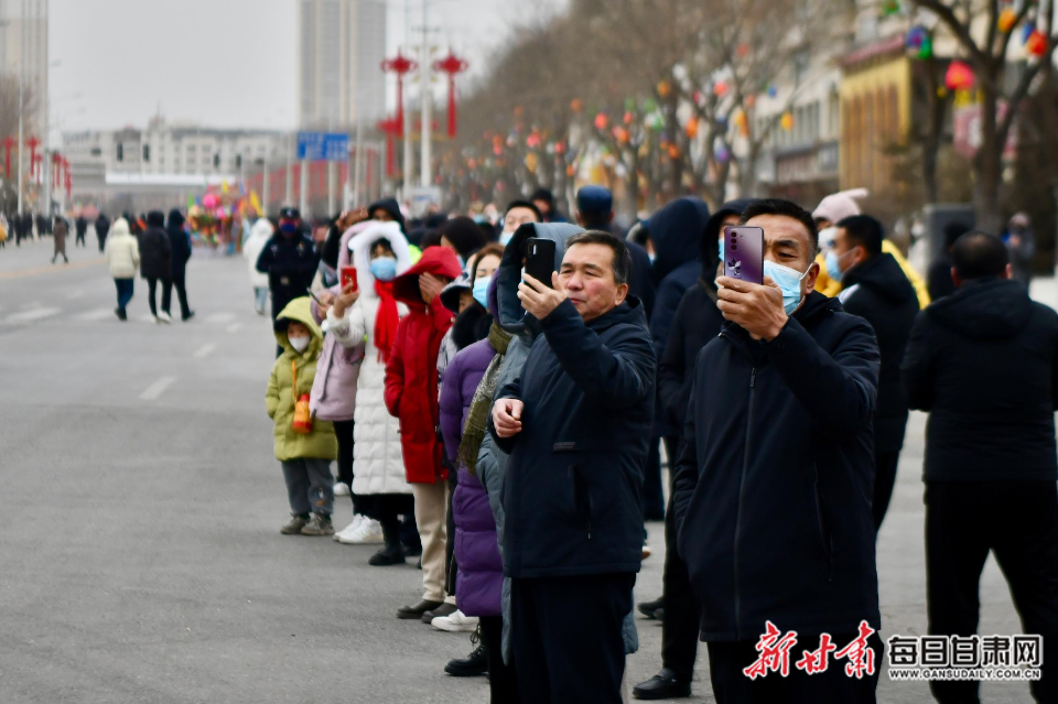 社火展演现场,表演队员们身着盛装,精神抖擞,神采飞扬,幸福生活伴随着欢快的鼓点溢出脸庞。舞龙、划旱船、“蛮婆子”等欢乐喜庆、年味十足的民俗表演纷纷亮相,让现场观众大饱眼福。“攒劲!”“耍得好!”活动现场热闹非凡,喝彩声、欢笑声、锣鼓声不断。观众或拿出手机记录这精彩的瞬间,或抱起孩子共享这欢乐时光,道路两边人头攒动,欢声鼎沸。