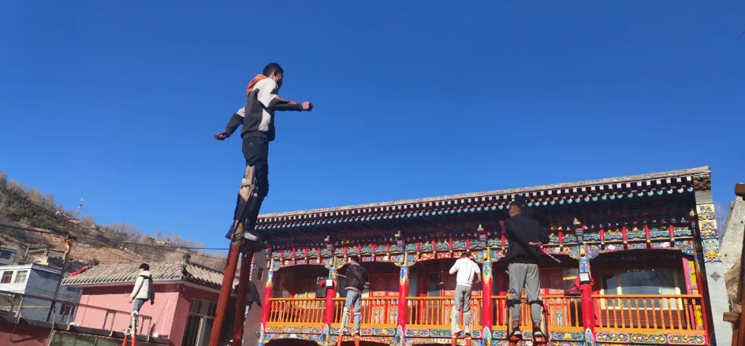 在鲁沙尔社火排练场,三米高的高跷棍整齐地摆放在围墙边,高跷表演者们坐在墙沿上为自己固定绑带。