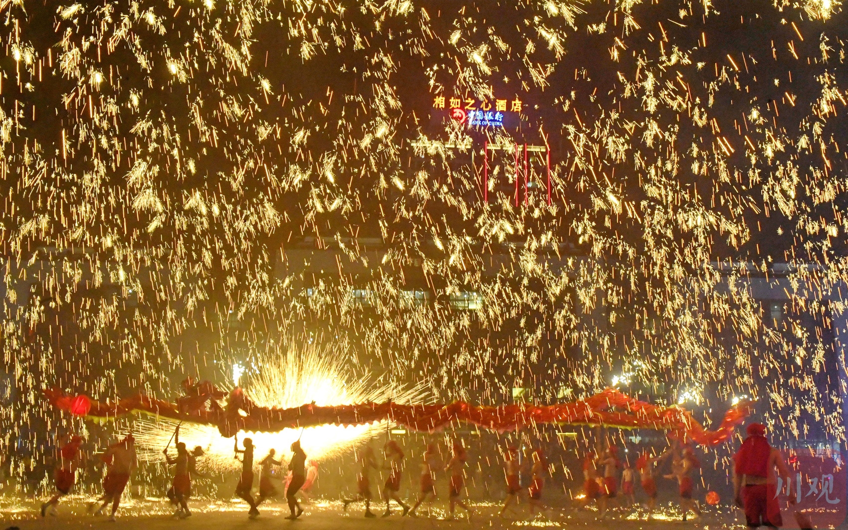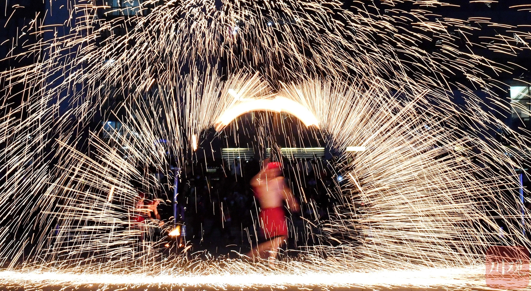 1月31日晚,在蓬安县相如广场,民间艺人表演“钢花火龙”迎春节。连日来,“我们的节日·春节”蓬安县2024迎新春文化惠民活动周在四川省南充市蓬安县启幕,活动依托本土文化资源和文艺人才,让大家沉浸式体验非遗文化和民俗活动,喜迎新春佳节。