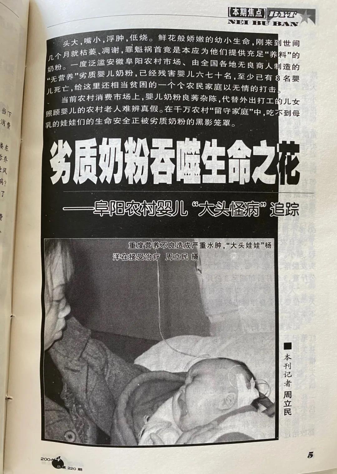 惭愧的是,这些年虽给半月谈写了一些稿件,但大多连自己都淡忘了,唯有2004年采写劣质奶粉戕害阜阳农村婴儿事件的前前后后印象深刻。很高兴能借这个机会,按杂志社老师的要求,说出当年因种种原因不便披露的一些隐情,权当为“中华第一刊”四十华诞奉上的一点心意。