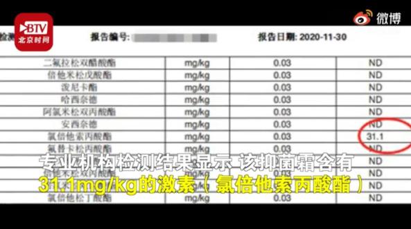 专业机构检测结果显示,该抑菌霜激素超标。目前,当地卫健委已责令该企业召回涉事产品,涉事企业已停产。