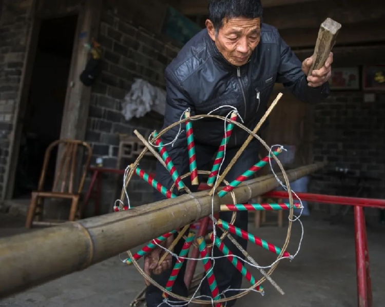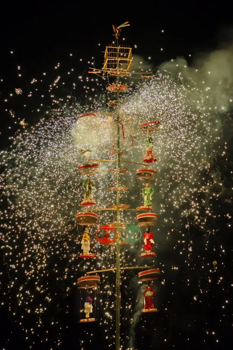 在一根长度为13至15米的毛竹竿上,隔层装置特制烟花轮和身穿光蜡纸服装的木偶,当最底层的烟花轮引线点燃后,会逐层喷放艳丽火花,带动木偶表演。
