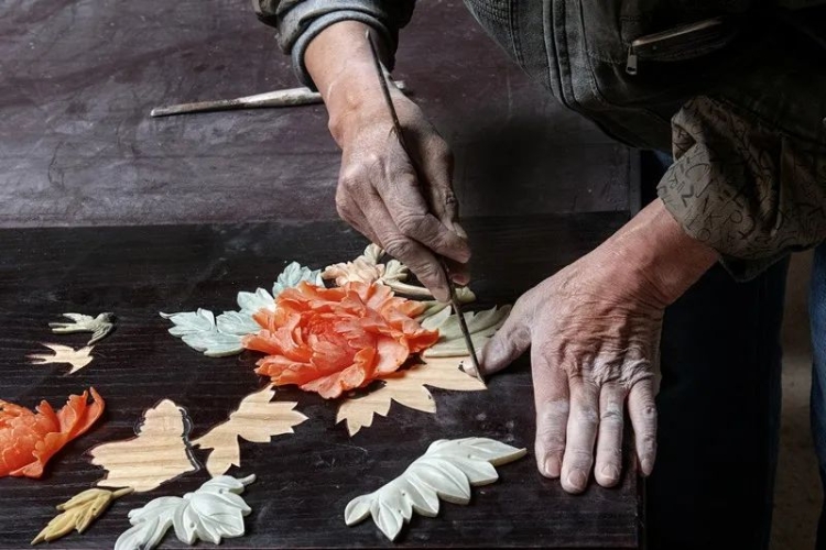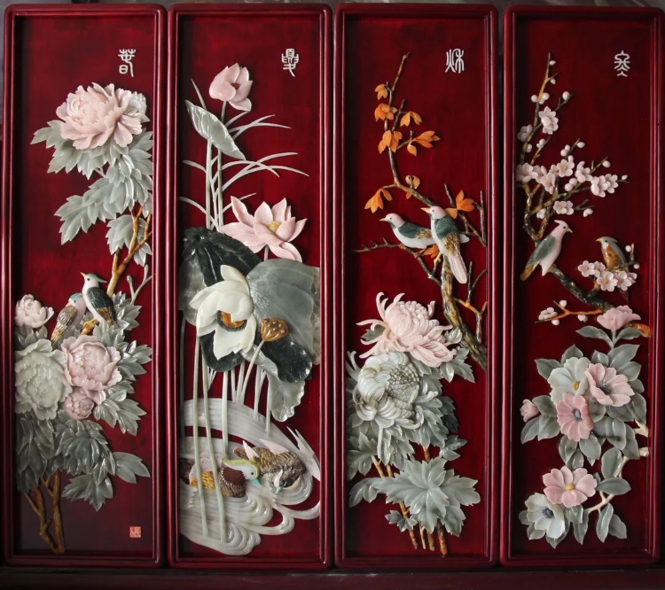 据有关资料分析,“彩石镶嵌”是由我国漆器工艺中的“嵌镙”演革而来。它主要是利用青田石的天然色彩,以浮雕的创作手法进行雕刻,而后将之镶嵌在木制品中,完成工艺。