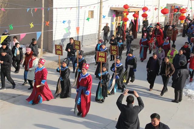 高台清街习俗的形成与宣化镇乐二村的秦腔戏班——乐善忠义班密切相关。每年农历正月十三,高台乐二村的村民会推选一位德高望重、能说会道的老者,穿官服,戴官帽,扮演“封官老爷”。“封官老爷”所到之处,街清院净,邻里结伴摆酒设宴,燃放鞭炮迎接“封官老爷”。“封官老爷”则下马作揖,拂袖掸尘,送上美好的祝福。清街后,大家也不急着散去,在街边聚餐玩乐,外出的能人、乡贤也会和留守的村民一起为乡村振兴出点子、想办法,共同谋划新一年的打算。“清街”集祈福、民俗、餐饮于一体,在长达几百年的时间里,一直延续了下来。