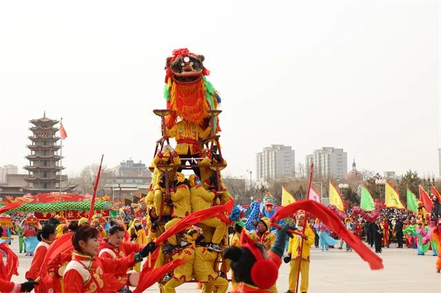 山丹舞狮有别于其他地方,主要以桌凳摞垒舞狮为主,舞狮在桌凳上表演惊险刺激,展示了舞狮者的高超技艺和不畏艰险的精神。耍龙和舞狮不仅寓意着风调雨顺、五谷丰登,更是吉祥瑞和的象征,为春节增添了浓厚的喜庆氛围。