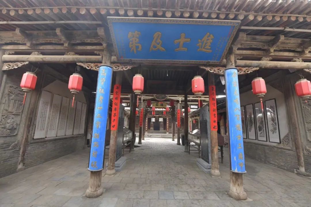 进入祠堂可见上方蓝色“进士及弟”匾,是高炳辰为其族祖高鸿儒题写,证明高姓曾是出过进士的高门大户。左右板对:上联“唐宋元明八百进士三鼎甲”,意为在唐宋元明四个朝代,全国高姓中考取了比八百个还要多的进士,占据进士前三甲;下联“高曾祖考廿二宰相两封侯”,意为高氏祖孙四辈中出了比二十二位还要多的宰相,其中两位被封侯爵。