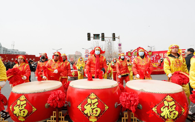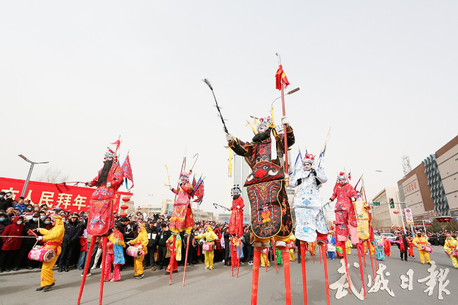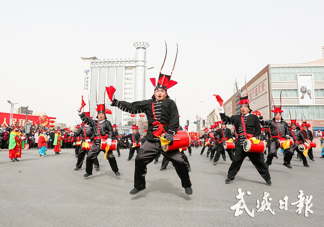 锣鼓喧天、欢声鼎沸。从天丰街到文化广场,从雷台什字到天马湖畔,虽寒意料峭,却仍有春意盎然——铿锵有力的锣鼓、上下翻飞的彩扇、欢腾跳跃的龙狮,经典的扮相、喜庆的服饰、幽默的互动,一队队各具特色的社火合着鼓点尽情舞动。