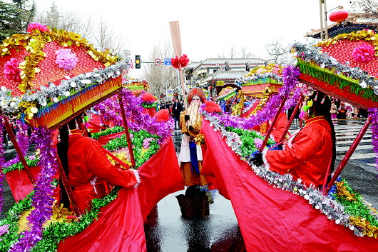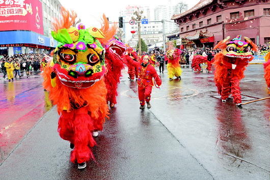 喧天的锣鼓打起来,欢快的秧歌扭起来,彩龙金狮舞出喜庆欢闹。农历正月十二、十三上午,秦州、麦积两区的社火汇演相继登场,来自各乡镇、街道办事处和企业以及民间的社火队热热闹闹走上街头,开展行进式表演和集中表演。震天的锣鼓、腾飞的巨龙、威武的雄狮、喜庆的高抬……参演人员个个精神抖擞、神采飞扬。舞龙队的“长龙”时而腾空跃起,时而蜿蜒低潜,时而翻滚盘旋;舞狮队的狮子或威猛雄壮、或憨态可掬,动作矫健、姿态百变;身着艳丽秧歌服的表演队员,尽情地挥舞着手中的彩带,踩着鼓点变换舞姿,把秧歌的热烈和欢腾展现得淋漓尽致。一时间,锣鼓声、掌声、喝彩声、欢笑声汇成一片。