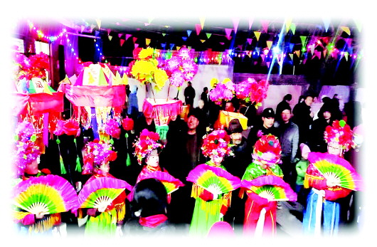然后就是唱曲子,多为两生两旦,不管男扮女装,或女扮男装,大都是边舞边唱,即所谓的对对戏。也有“对口曲”、小调、对唱、小剧曲目等,其中最具代表性的曲目有《下四川》《李三娘研磨》等。之后就是笑谈,笑谈类似于家常闲话,上场的人物多是两老旦一小旦。在曲调上,有背弓调和月调;在唱词上,各不相同,但都乡土气味浓郁,古朴动听。最好看的则是快书,即溜干场。所谓溜干场,指专门在上下换场的间隙表演。所扮丑角表演时有说有笑,有哭有闹,而内容多为劝善、向善。