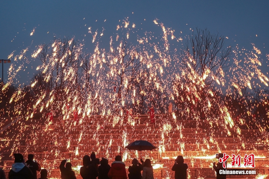 江苏盱眙,国家级非物质文化遗产打铁花上演。春节期间,千年古城江苏盱眙第一山历史文化街区举办“逛第一山古城品老街味道”系列文旅活动。泱波 摄