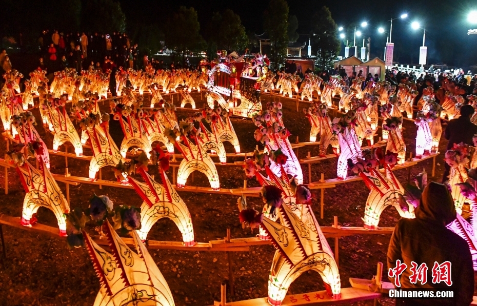 浙江台州,金竹溪村锣鼓喧天,人头攒动,当地安山村舞龙队400多村民舞起一条数百米长的板凳龙,祈愿新的一年五谷丰登、风调雨顺。陈月明摄