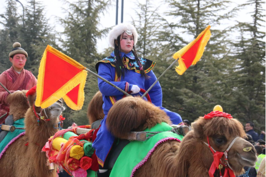 “你看,骆驼社火!”人群中发出一道惊呼,只见迎面走来了一支队伍扮演着汉武帝西巡登临陇关的场景,紧接着张骞和文武随行乘着马,号手鸣号随行,商人乘骑骆驼,满载茶叶、丝绸前行,用锣鼓队、社火小调、耍双枪还原历史,完美展示传承与发展的律动。