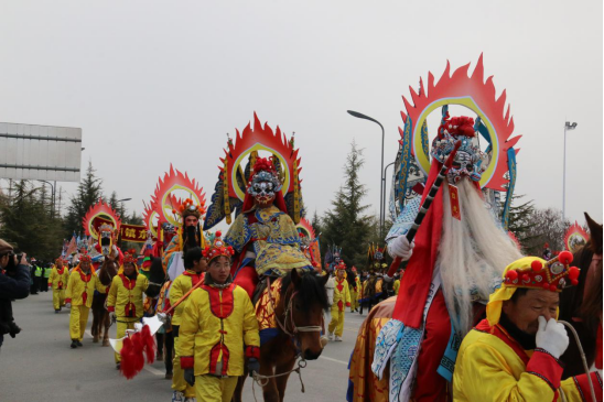 一大早,四面八方的群众纷纷涌向县城,距社火表演还有1个多小时,看社火的观众已沿街道两边筑起厚厚的人墙。上午10时整,社火游演正式开始,一时间,锣鼓震天,精心装扮的各式社火犹如一条开闸的彩色河流般铺展开来,黑虎与灵官走在队伍最前列,关羽、财神爷紧随其后,身着铠甲战袍的装扮者,手持刀、枪,骑骡坐马,雄姿猛健,威风凛凛,用鸡蛋皮做成的“疙瘩”贴在脸上,生动夸张,威武的雄狮前后跳跃,欢快的旱船来回穿梭,秧歌队的大婶们翩翩起舞。
