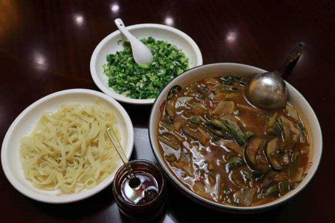 “三套车”由行面、腊肉、茯茶组成,讲究荤素搭配、阴阳调和。面要爽滑筋弹,汤汁卤香鲜亮,腊肉肥而不腻,茯茶温润养人。这大概是中国式套餐的鼻祖,有主食、有配菜、还有饮品。三套车是武威舌尖上的城市名片,在懂得感恩的武威人心中,生活就是有吃有喝,知足常乐。